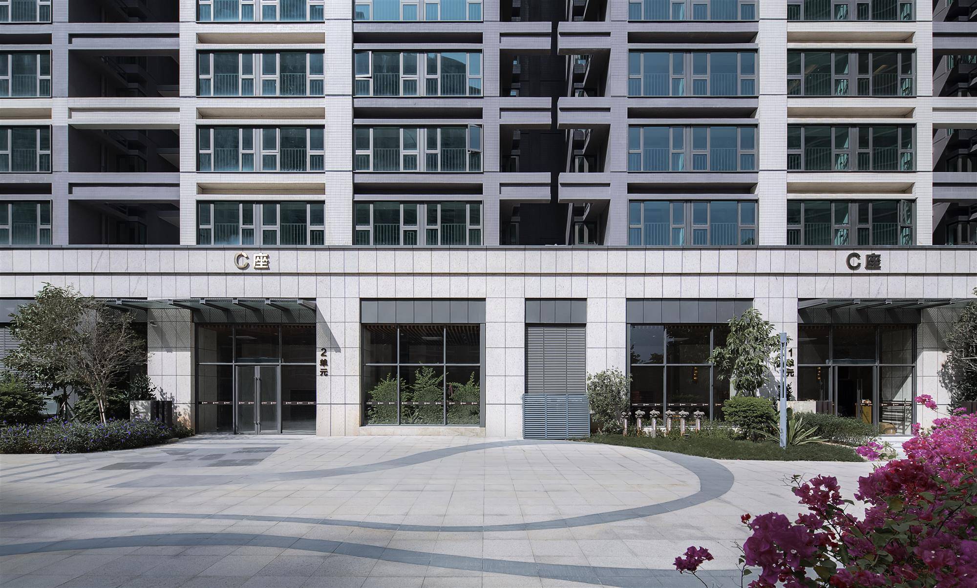 塔楼外立面整齐挺拔,形体顶部、底部以及局部挑空,创造出波动的底层连续架空空间和顶部动感天际线。针对高容高密住区,设计团队充分利用小户型的凹槽设置空调及管线,通过立面线条控制凸窗高度,利用构造遮挡,避免室外挂机、管线外露,保证建筑立面整体性。
