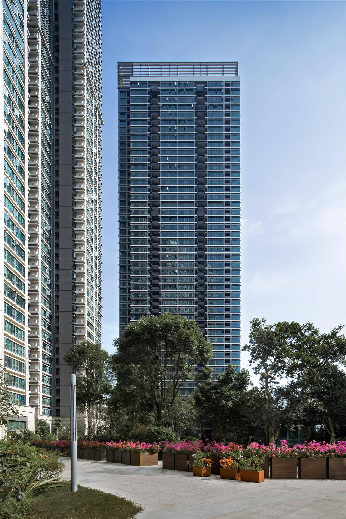 深圳金领假日公寓位于福田南路和滨河大道交汇处,地处土地资源稀缺的皇岗口岸片区。项目总用地面积约 12600 ㎡,总建筑面积约 182600 ㎡,由 3 座超高层塔楼及一层裙房(局部三层)、四层地下室、一层半地下室组成。如何在有限用地内平衡容积率和日照、视野、城市友好性、居住价值,提升城市居住品质,是金领假日公寓核心设计难点。项目经过 7 年的建设周期,于 2019 年 12 月顺利落成竣工。