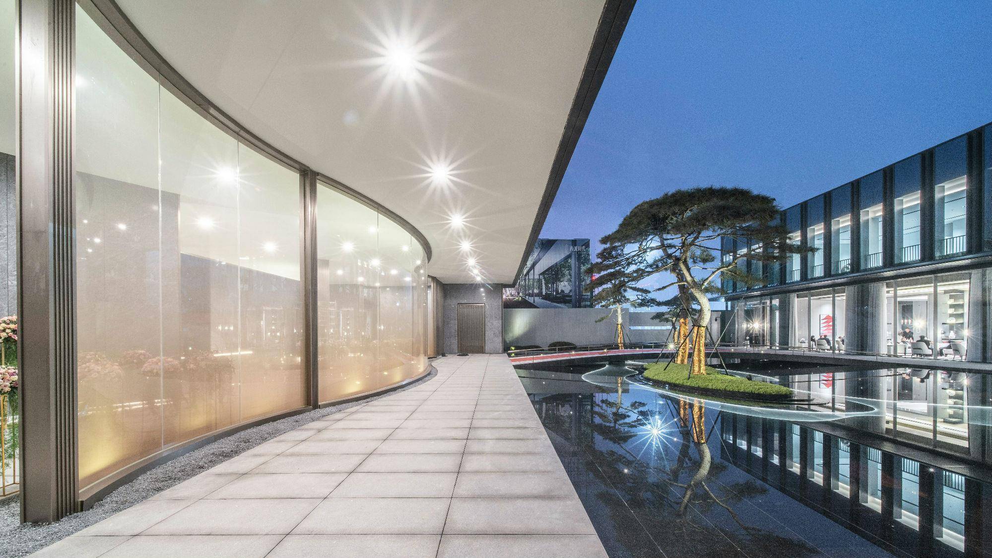 转屏风而入,仿佛进入了另一方天地,门内与门外恍如隔世,大面积运用静水面,并于水面上种植七棵具有傲骨气质的造型松树,中庭空间水景、松树、拱桥交相辉映,彰显东方气质。