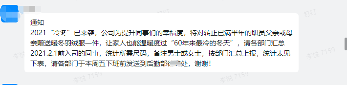 成都,作为一个没有秋季的城市,今年的冬天来得比以往好像都更早一些,夏日的酷暑过去就是寒冷的冬天。为了让员工感觉到温暖,公司提出了为员工父母送羽绒服的福利。